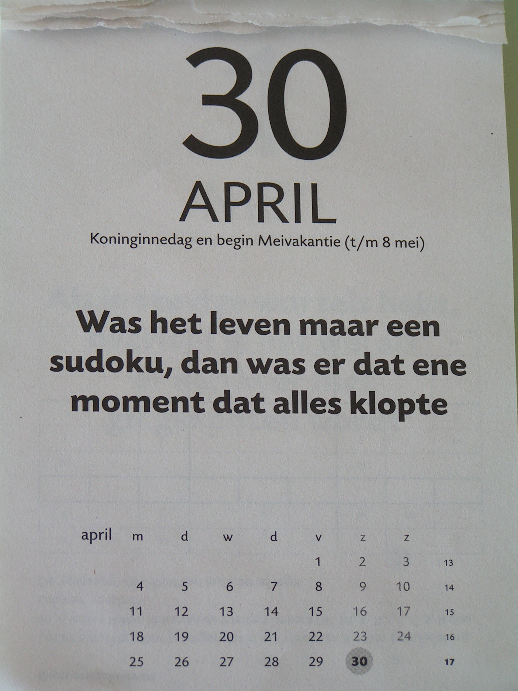 Mmm, hier moet ik nog even over nadenken. Ga ik dit moment ooit meemaken? Het is me namelijk nooit, maar dan echt nooit gelukt om een sudoku – zelfs op beginners niveau – te maken! Dit delen: Klik om te delen op X (Opent in een nieuw venster) X Klik om te delen op Facebook (Opent in een nieuw venster) Facebook Vind-ik-leuk Aan het laden... Gerelateerd