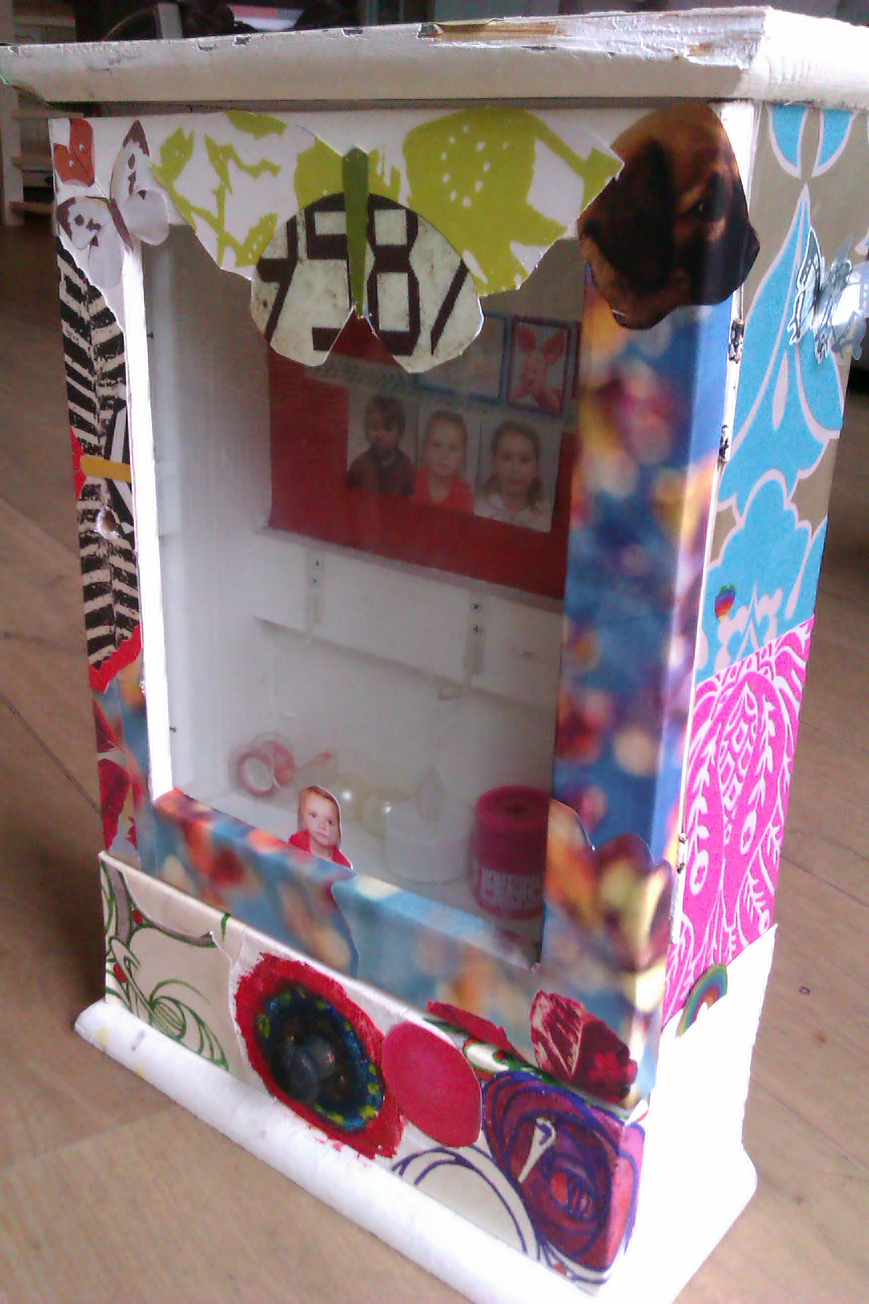 We waren aan het opruimen geslagen. Er moest nodig een ritje naar de Kringloop worden gemaakt want de berg onmogelijke voorwerpen bij de voordeur groeide gestaag. ‘Deze mag niet weg’, riep mijn dochter verbolgen, ‘die wil ik wel hebben!’ Ze trok een klein kastje onder een oud kinderzitje en een overtallige wasmand vandaan. Het sleutelkastje. Ik herkende het meteen want ik heb het kastje zelf gekocht, een paar jaar geleden. Destijds overtuigd dat het vreselijk handig zou zijn en van pas zou komen in ons toen nog nieuwe huis. Nadat het jaren stof stond te vergaren onder de trap, besloot ik wijs dat wij toch niet zo’n goede match waren, het sleutelkastje en ik. Mijn dochter zag echter mogelijkheden en daardoor bekeek ik het ding ook weer met andere ogen. Samen hebben we het kastje helemaal mooi gemaakt; we knipten, scheurden en plakten illustraties en foto’s uit tijdschriften, op het deurtje, de bovenkant en zelfs de binnenkant werd voorzien van een leuk rood stipje. Soms zou ik het heel anders aanpakken en jeukten mijn handen, maar ja, het was niet langer mijn kastje maar het kastje van mijn dochter. En het eindresultaat is natuurlijk geweldig!