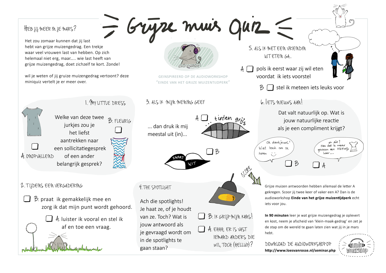 Klik op het plaatje, print de afbeelding. Kruis de antwoorden aan die op jou van toepassing zijn en ontdek of jij een grijze muis bent! Dit delen: Klik om te delen op X (Opent in een nieuw venster) X Klik om te delen op Facebook (Opent in een nieuw venster) Facebook Vind-ik-leuk Aan het laden...